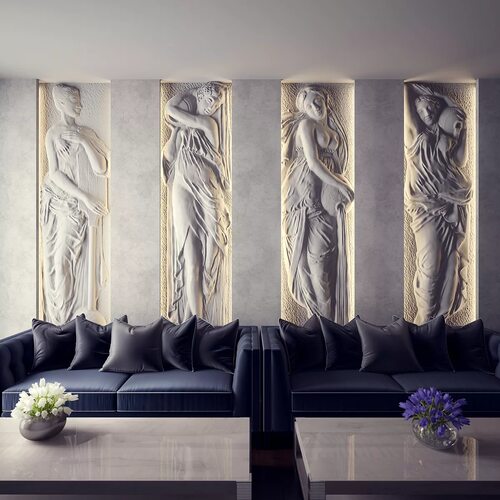 1. Барельефы на стенах. Установка барельефов на стенах придает помещению изысканность и оригинальность. Они могут быть размещены как отдельными элементами, так и в композиционных группах, создавая уникальный фокусный акцент в интерьере.