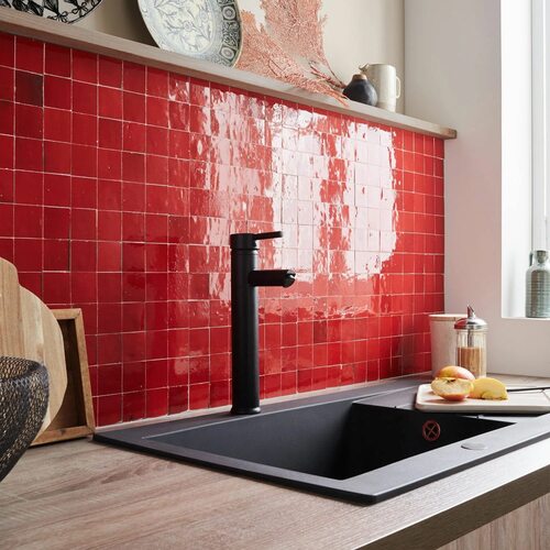 Существует множество вариантов красной плитки для кухонного фартука. От классической прямоугольной формы до нестандартных геометрических фигур. Вы также можете выбрать глянцевую или матовую отделку, что добавит интересный текстурный эффект.