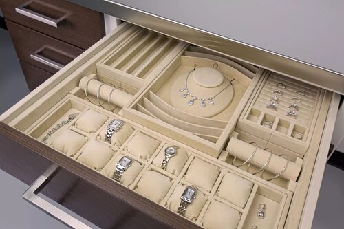 Лоток для украшений в шкафу может быть использован не только для хранения украшений, но и для организации других мелких предметов, таких как часы, очки, или даже косметика. Это универсальное решение для организации пространства в вашем шкафу, которое поможет вам держать все в порядке и легко найти нужные вам вещи.