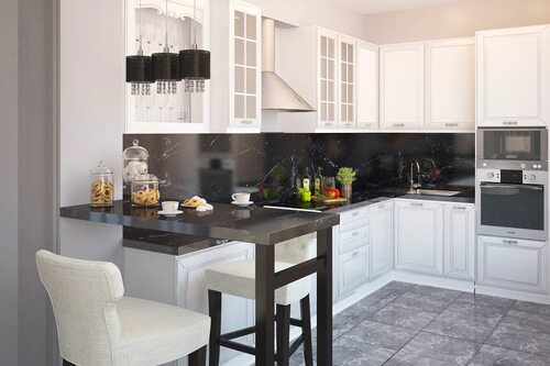 Белые фасады кухонных шкафов, стильные ручки, мраморная столешница и элегантная барная стойка - все это характеризует классический дизайн кухни в белых тонах. Фотографии прекрасно передадут атмосферу уюта и изыска.
