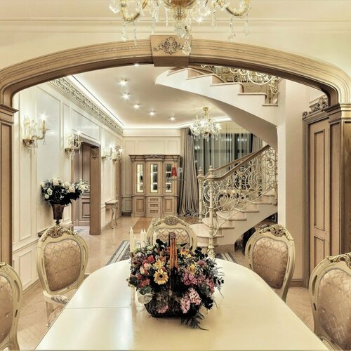 Дизайн дома в стиле классика характеризуется использованием изысканных деталей, роскошных тканей, обильным декором и изящными формами. Он часто включает в себя высокие потолки, кристальные люстры, мраморные элементы, массивную мебель и изысканные обои. Классический стиль подчеркивает изысканность и роскошь, создавая атмосферу утонченного комфорта.