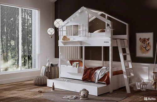 Кровать-домик Буквуд выполнена из высококачественных материалов, обеспечивающих прочность и долговечность. Уникальный дизайн в виде домика создает атмосферу уюта и комфорта, а также стимулирует развитие фантазии у вашего малыша.