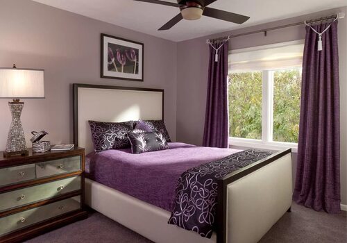 Лавандовые стены придают спальне нежный и романтичный вид. Комбинируйте их с белыми мебелью и аксессуарами для создания светлого и воздушного интерьера. Фотографии таких спален помогут вам понять, как использовать лиловый цвет в дизайне вашего пространства.