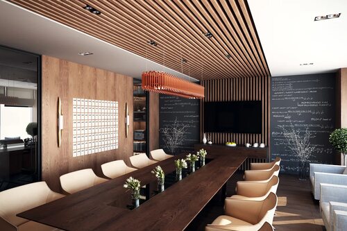 Аксессуары, такие как картины в промышленном стиле, фигуры из металла и стекла, а также растения, добавят уют и индивидуальность комнате переговоров.