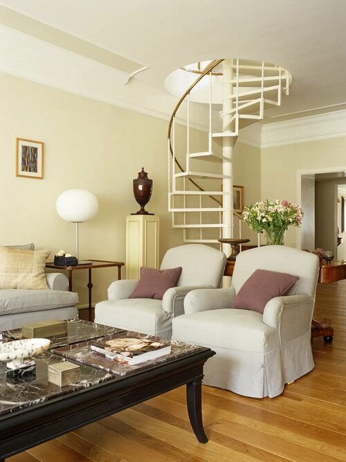 Идеи дизайна гостиной с винтовой лестницей