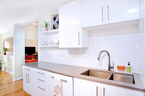 4. Фартук из искусственного камня. Искусственный камень обладает широким спектром цветовых решений и текстур, что позволяет подобрать идеальный вариант под белую кухню. Он легко моется, устойчив к влаге и теплу, что делает его практичным и долговечным решением.