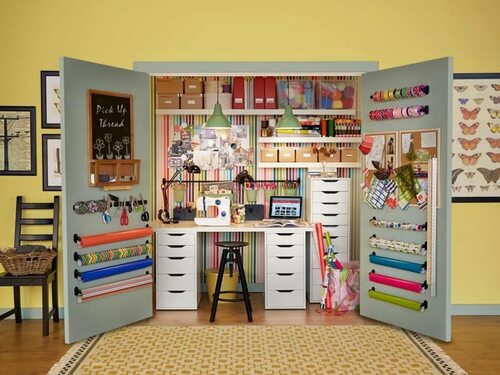 Существует множество различных типов и моделей шкафов для творческой мастерской, от открытых полок до закрытых секций с ящиками. Вы можете выбрать шкафы, которые соответствуют вашим потребностям и помогут вам организовать пространство так, как вам удобно.