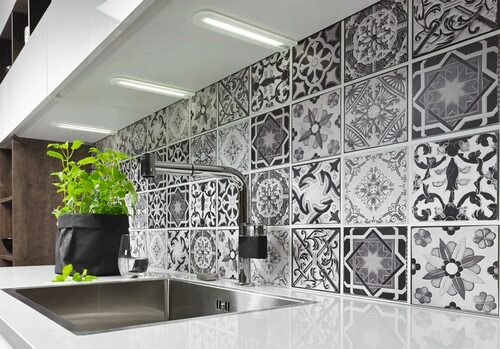 Классические узоры, такие как геометрические узоры, цветочные мотивы, винтажные рисунки и традиционные орнаменты, могут придать кухне элегантный и изысканный вид. Они могут быть использованы на плитке для фартука, обоях, текстиле и других элементах интерьера.