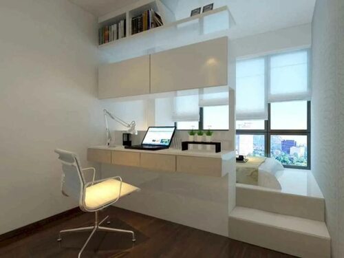 Интерьеры с кроватью-подиумом и рабочей зоной
