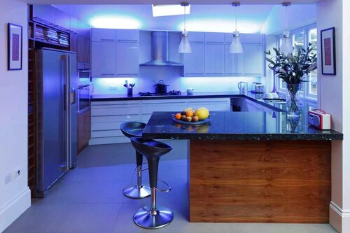 Одним из важных аспектов подсветки кухни является освещение рабочей зоны. Варианты включают в себя подсветку под верхними шкафами, светодиодные ленты, встраиваемые светильники и многое другое. Посмотрите наши фотографии для идей подсветки рабочей зоны кухни.