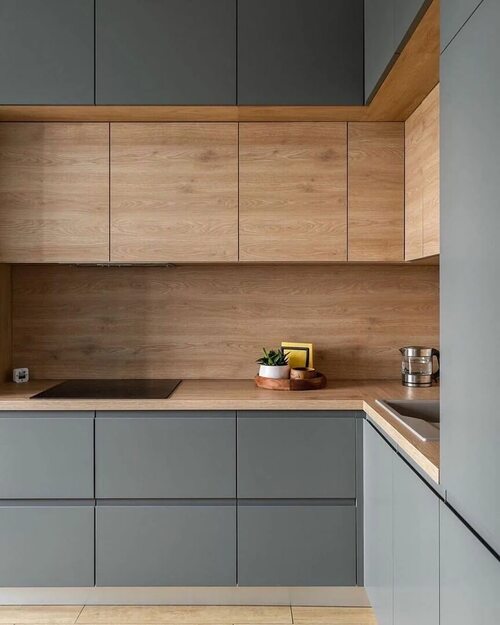 Серый фасад кухни с столешницей под дерево - это стильное и современное решение для вашей кухни. Этот дизайн сочетает в себе элегантность серого цвета с теплотой и натуральностью дерева, создавая уютную и привлекательную атмосферу.