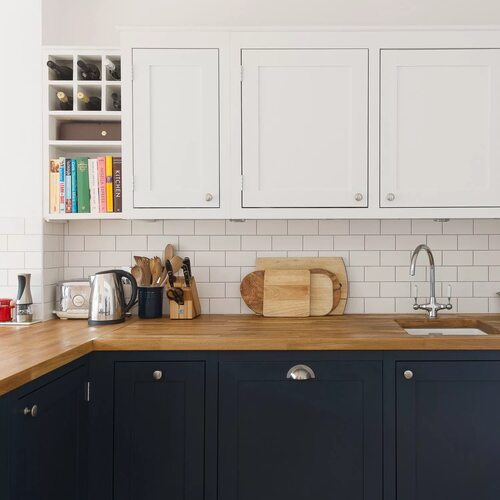 Для вдохновения предлагаем посмотреть фотографии кухонь с синим низом, белым верхом и деревянной столешницей в нашей подборке.
