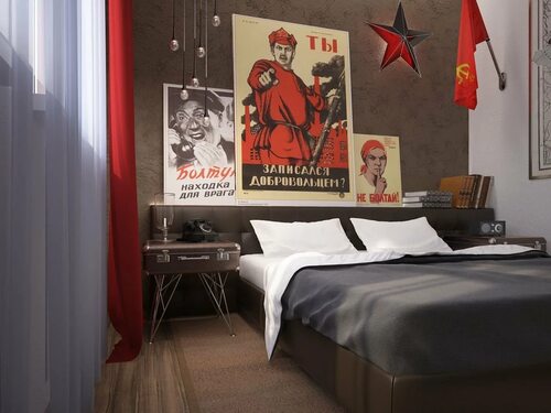 - Наличие традиционных советских элементов декора, таких как плакаты, флаги и советская символика.