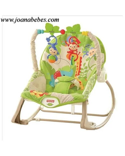 Кресло качалка Fisher Price \"Веселые обезьянки из тропического леса\" имеет яркий дизайн с изображением обезьянок и тропического леса, что делает его привлекательным для малышей. Оно оснащено удобными поручнями и мягким сиденьем, что обеспечивает безопасность и комфорт при качании.