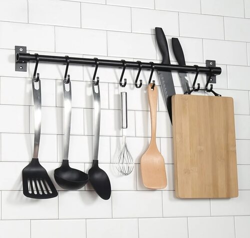 Фото 1: Пример использования крючков на кухонном рейлинге для подвешивания кухонной утвари.