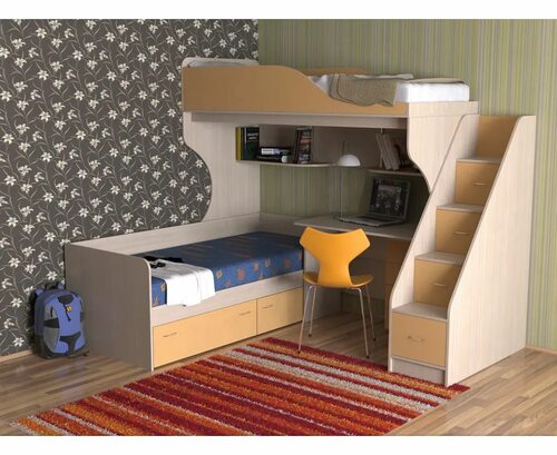 Кровать чердак дуэт 5 оснащена лестницей, что обеспечивает удобный доступ к спальному месту. Ее функциональность позволяет использовать свободное пространство под кроватью для хранения вещей или организации рабочего уголка.