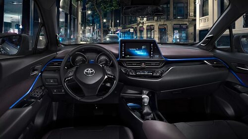 Салон Toyota C-HR предлагает комфортное пространство с высококачественными материалами отделки. Приборная панель выполнена в современном стиле, с удобно расположенными элементами управления и информационным дисплеем.