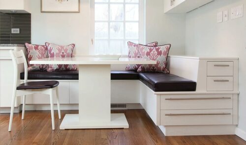 Для кухни с угловым диваном подбирают компактные столики, которые не занимают много места, но при этом функциональны и стильны. Можно выбрать столик с ящиками для хранения посуды или книг, а также с выдвижной столешницей, которая увеличит рабочую площадь при необходимости.
