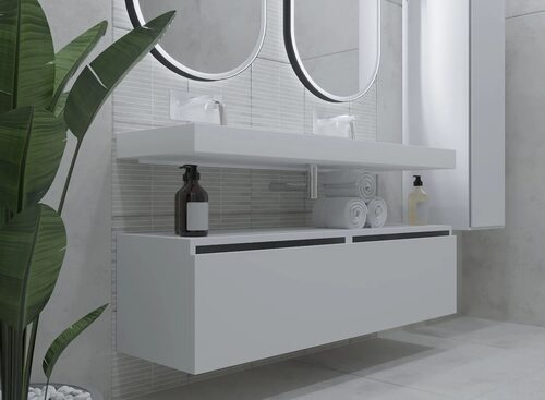 Ниже представлены фотографии различных моделей тумб под раковину 140 см подвесных в белом глянце, чтобы вы могли выбрать оптимальный вариант для своей ванной комнаты.