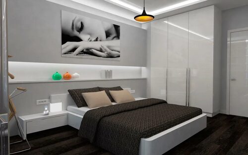 Для спальни 12 кв м в стиле хай тек подойдет мебель с удобными функциями. Например, кровать с механизмом подъема, вместительные шкафы с раздвижными дверями, компактный стол для работы или макияжа.
