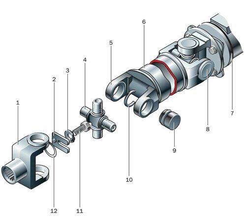 Карданный шарнир состоит из нескольких элементов, включая внутренний и внешний кольца, шарнирные шарики, кольца уплотнения и смазочные каналы. При передаче крутящего момента шарнирные шарики позволяют компенсировать разницу в углах между валами, обеспечивая плавную передачу вращения.