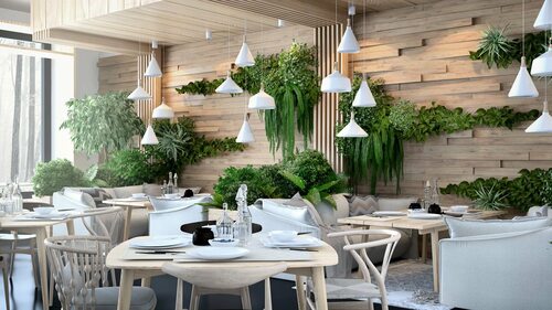 Современные интерьеры кафе с зеленью представляют собой уникальное сочетание современного дизайна и природной красоты. Зелень в интерьере кафе придает помещению свежесть и природную гармонию, создавая уютную атмосферу для посетителей.