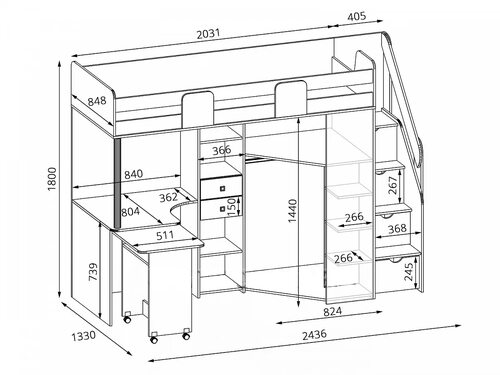 Кровать чердак Мийа доступна в нескольких стандартных размерах, включая односпальные и полуторные варианты. Основные размеры включают длину, ширину и высоту кровати, а также высоту до нижнего уровня, где можно разместить рабочий стол или шкафчики.
