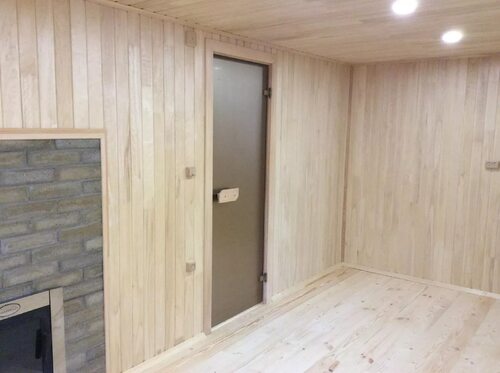 2. (фото панелей МДФ в бане с деревянной отделкой)