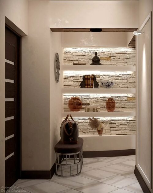 Коридоры часто являются узкими и неудобными для хранения вещей. Встроенные полки в стене могут решить проблему хранения и в то же время стать стильным элементом декора. Они могут использоваться для хранения обуви, книг, декоративных предметов и многого другого.