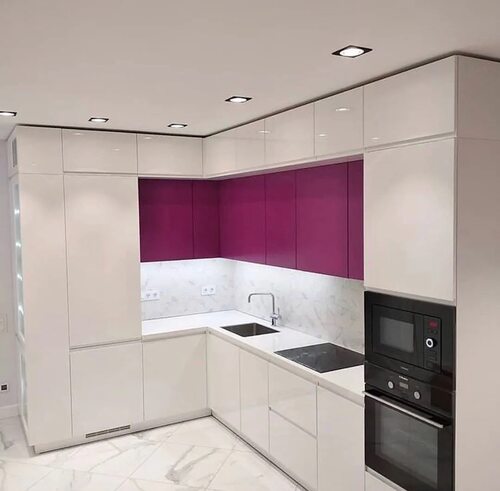 Установка двухъярусной угловой кухни под потолок также позволяет использовать верхние шкафы для хранения редко используемых предметов, освобождая нижние шкафы для более часто используемой посуды и кухонной утвари.